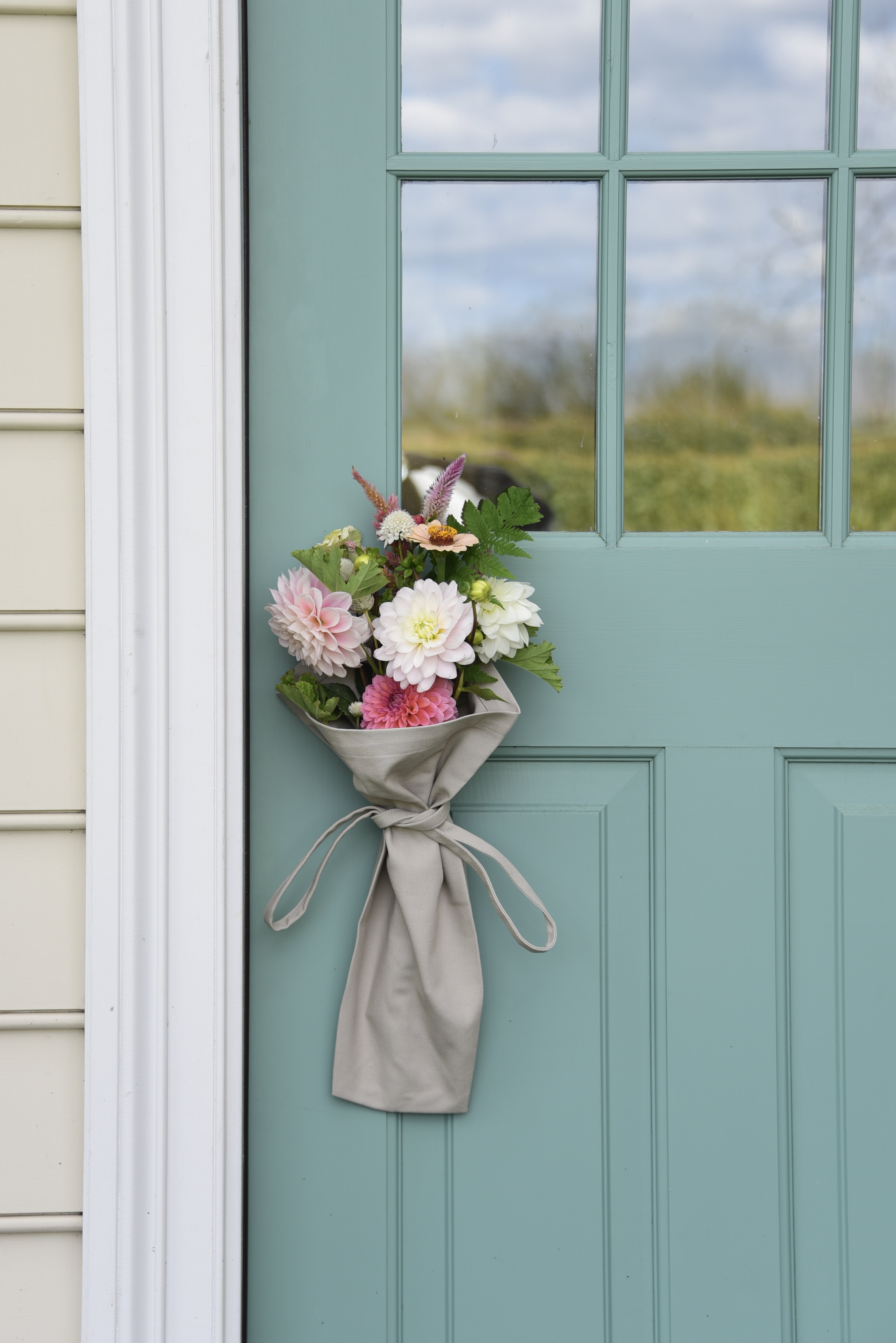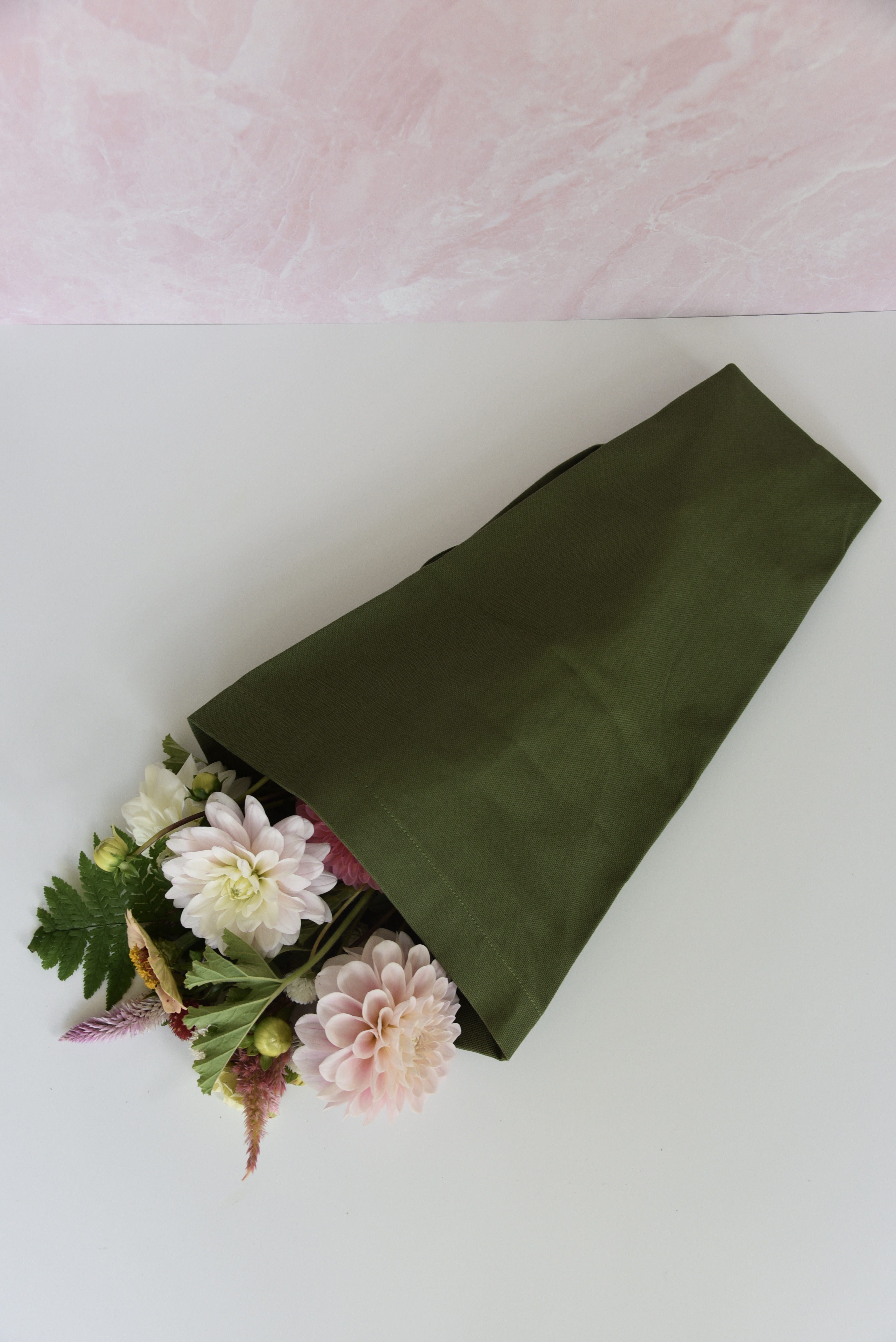 The reusable flower garden tote is designed to hold flowers, garden stems, and herbs. The two straps wrap around and tie in front for easy bundling, while the back-seam opening easily hooks on a wall or doorknob to hang vertically.